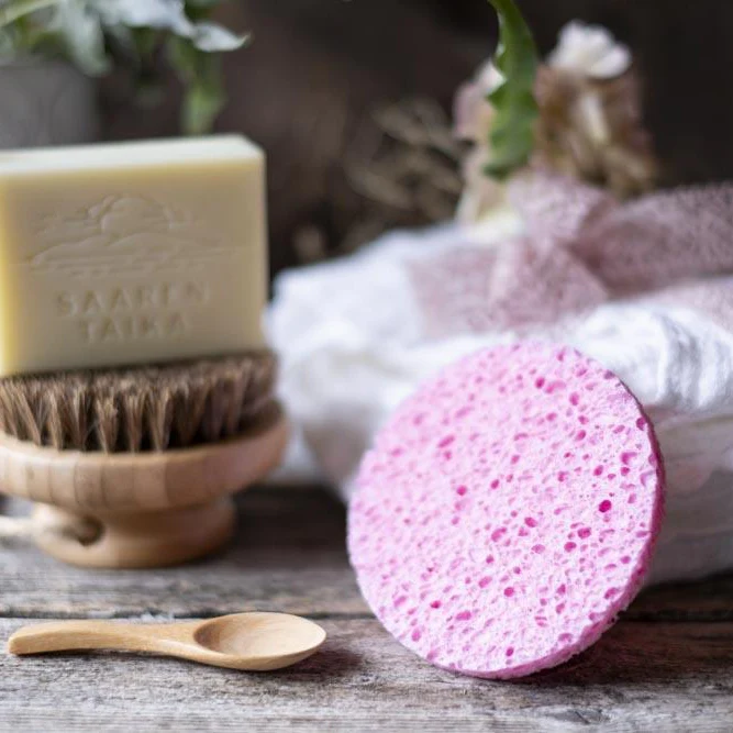 Puhdistussieni on valmistettu 100% luonnollisesta puumassasta (selluloosa), joka on biohajoavaa. Se on hellävaraista iholle, eikä aiheuta ihoärsytystä.