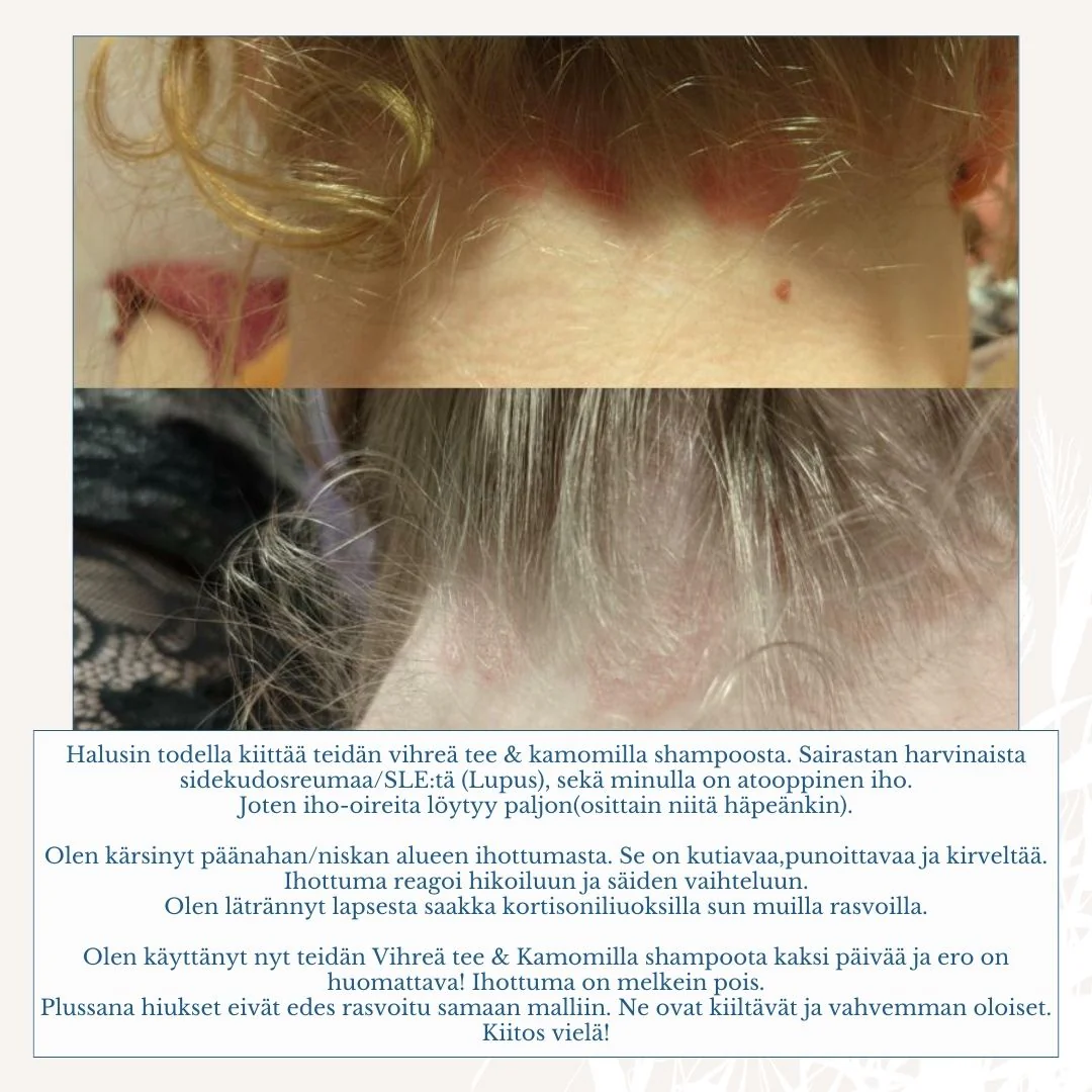 "Pojallani on psoriasisläiskiä päänahassa. Mikään ei tuntunut auttavan kutinaan. Välillä oli pakko leikata hiukset ihan lyhyeksi tai jopa kaljuksi, jotta päänahka tuulettuisi eikä kutiaisi niin paljon. Hämmästyttävää kyllä, jo ensimmäisen Vihreä Tee & Kamomilla shampoo käyttökerran jälkeen kutina helpottui vähän. Tällä hetkellä päänahka rauhoittunut shampoon ansiosta melko hyvin, ei tosin ihan kokonaan. Kiitos tästä!" -Minna R.
