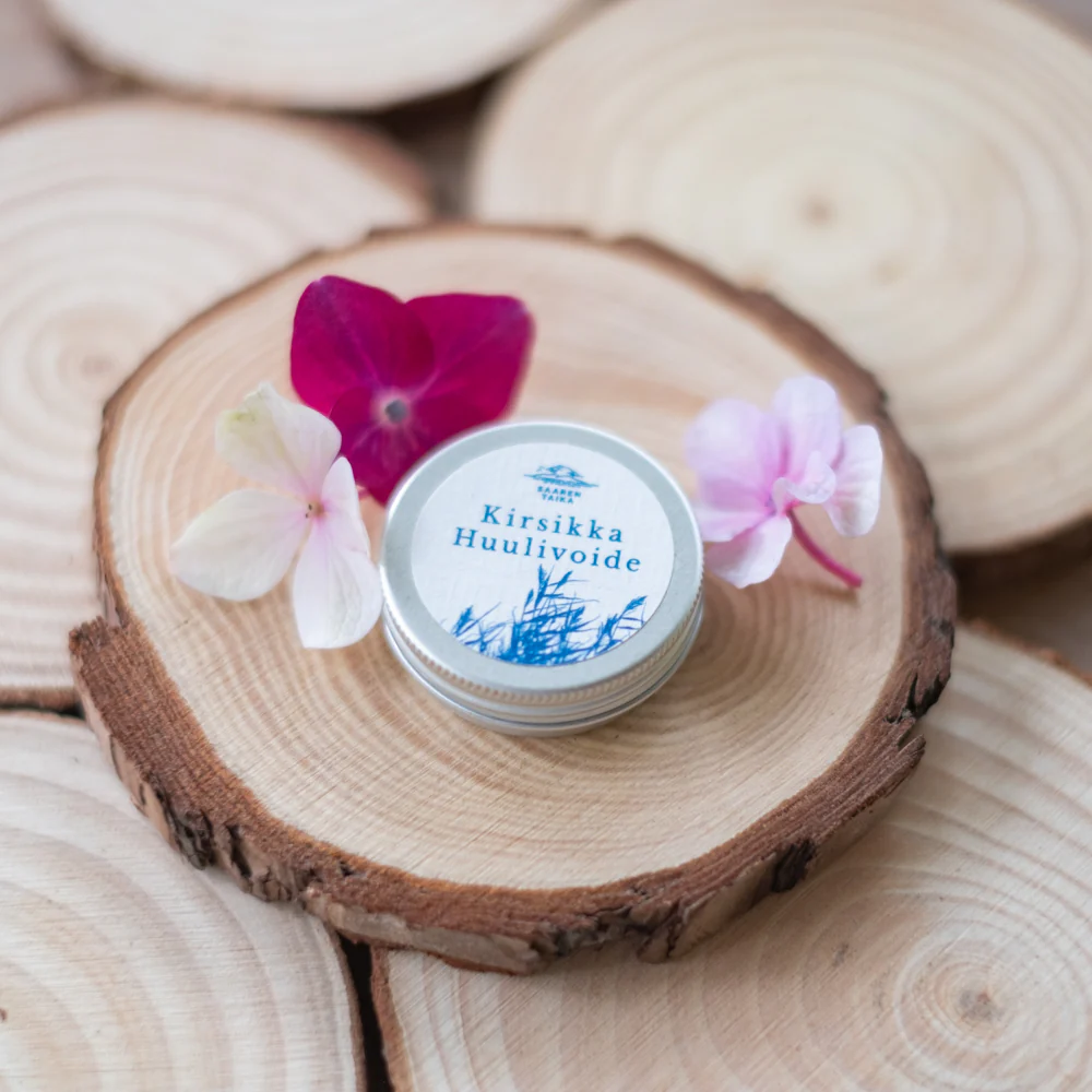 Kirsikantuoksuinen, kauniiseen pieneen rasiaan pakattu Saaren Taika Kirsikka huulivoide suojaa huuliasi kuivuudelta, auringolta, pakkaselta ja viimalta.