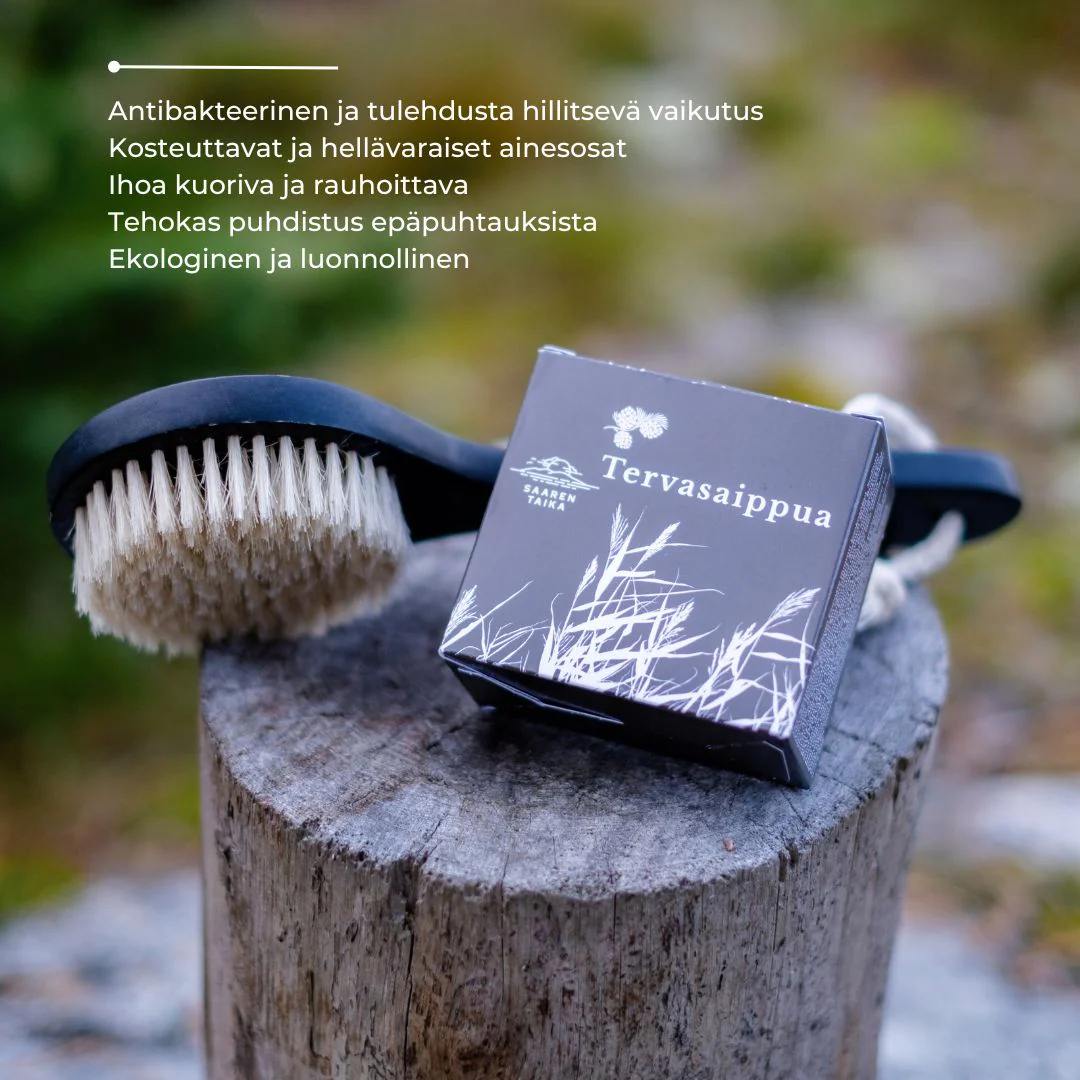 Miskan Tervasaippua on antibakteerisia ominaisuuksia omaava ja tulehdusta hillitsevä palasaippua, joka helpottaa kutinaa ja ärsytystä sekä saattaa auttaa pitämään ötökätkin loitolla, siksi se sopii erityisen hyvin myös retkille mukaan!